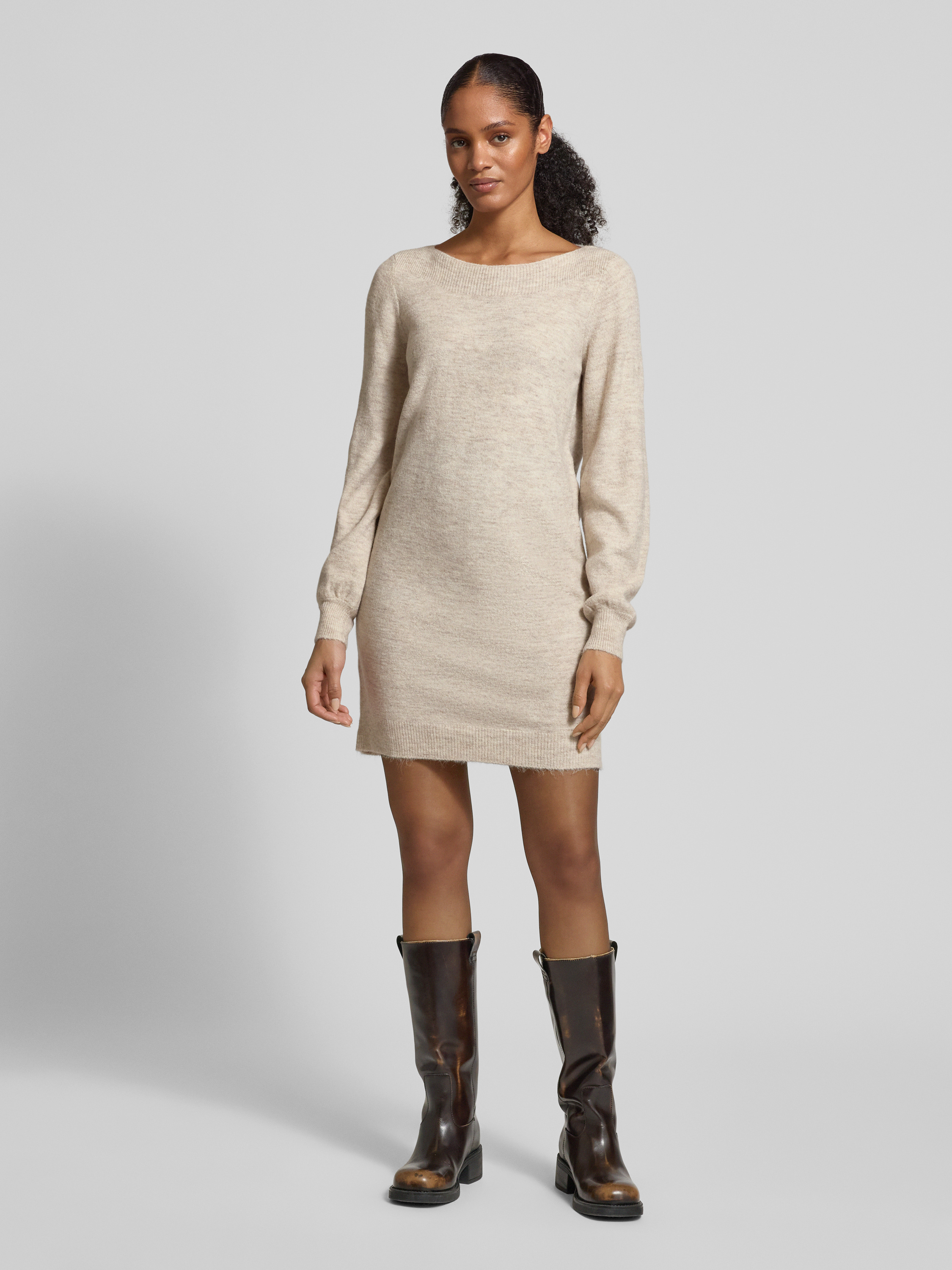 Sukienka z dzianiny o luźnym kroju z dekoltem z łódkę model ‘LEFILE’ - écru melanż