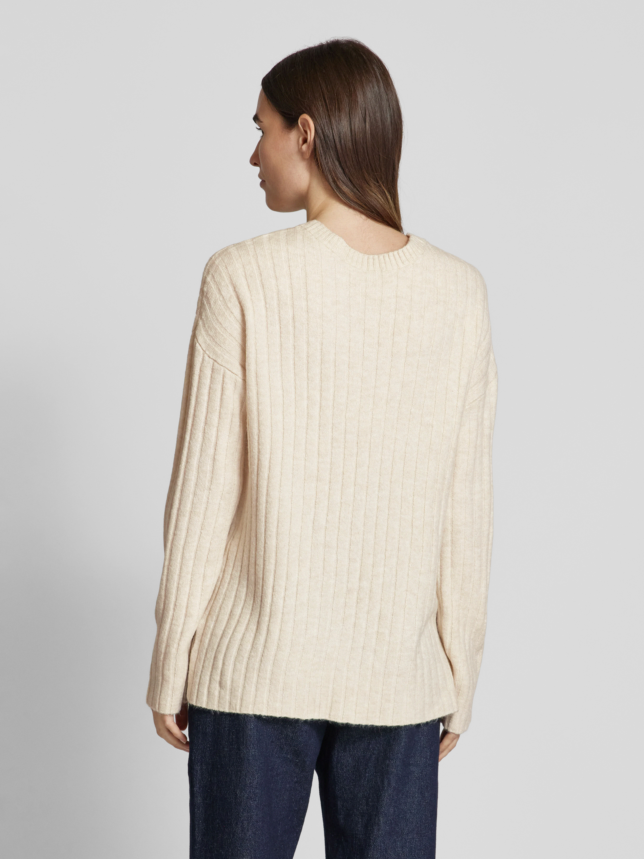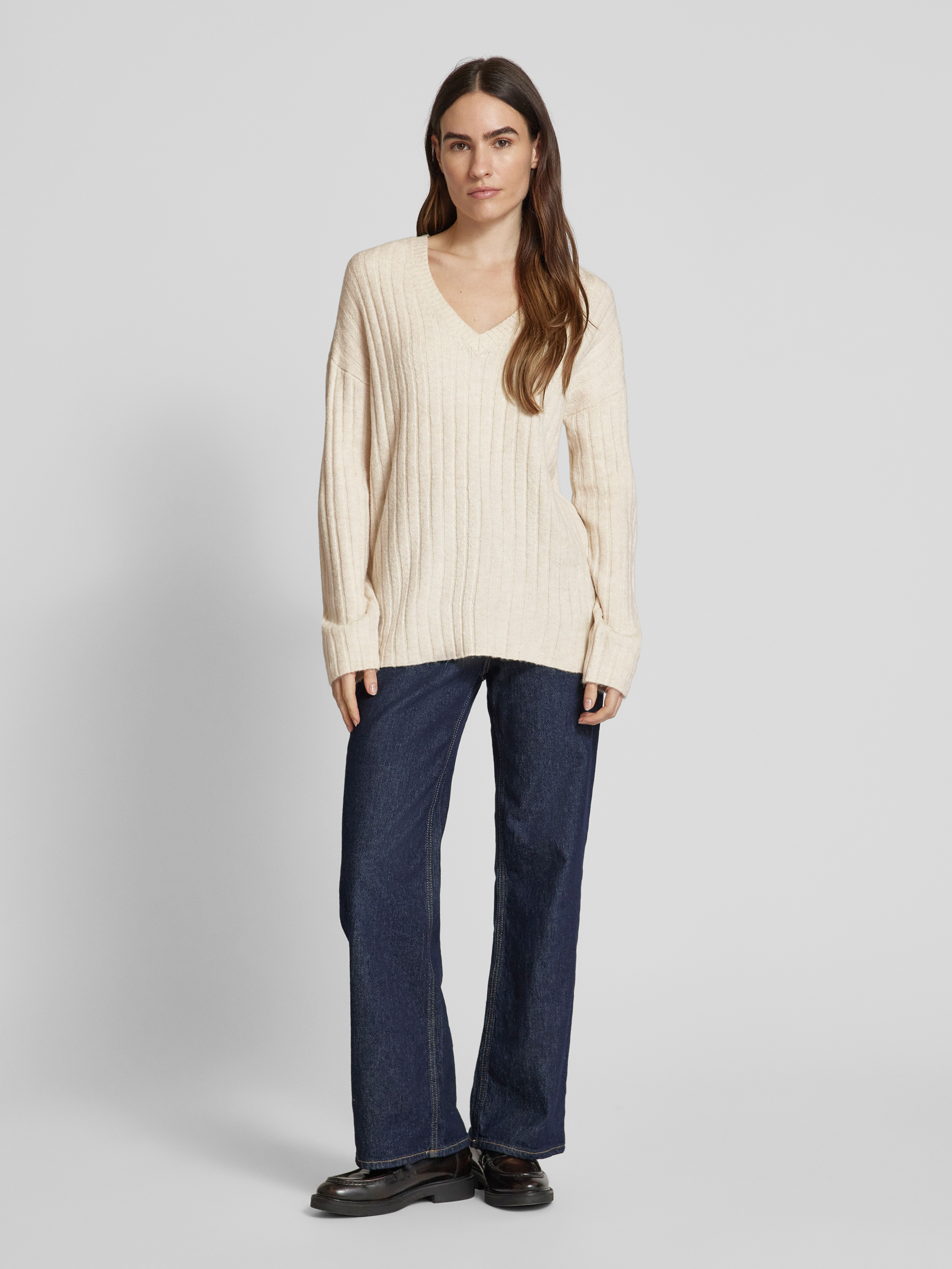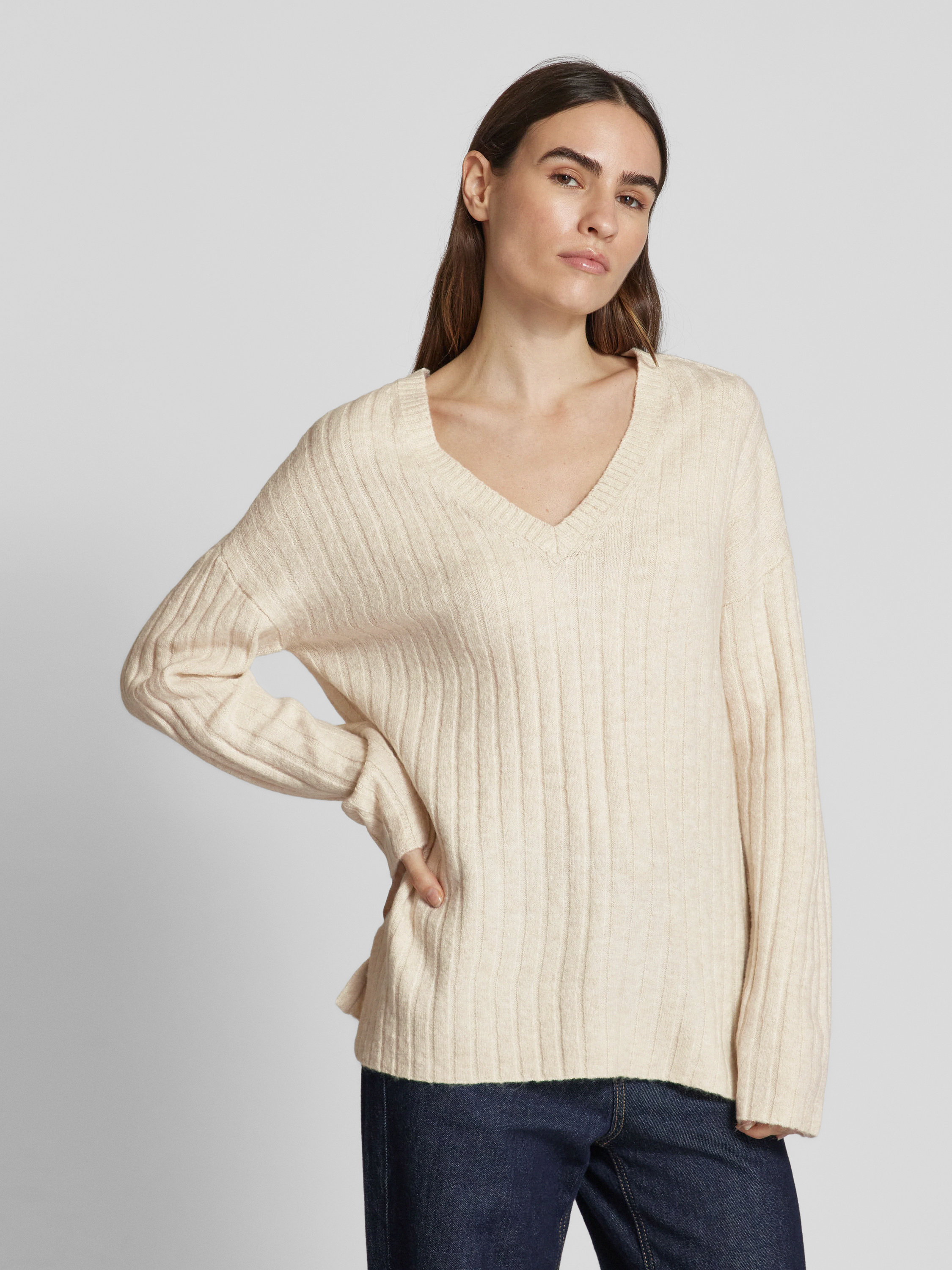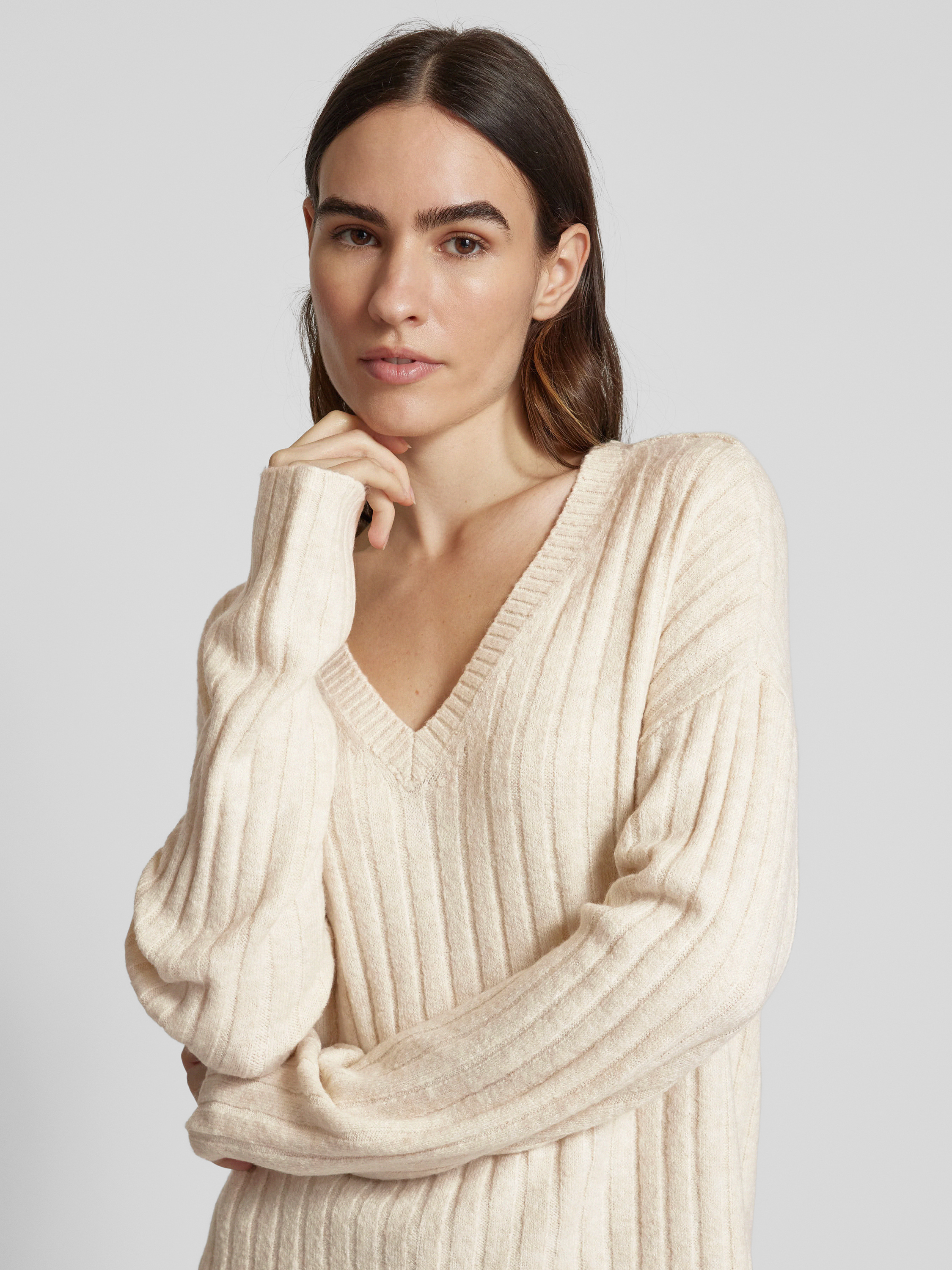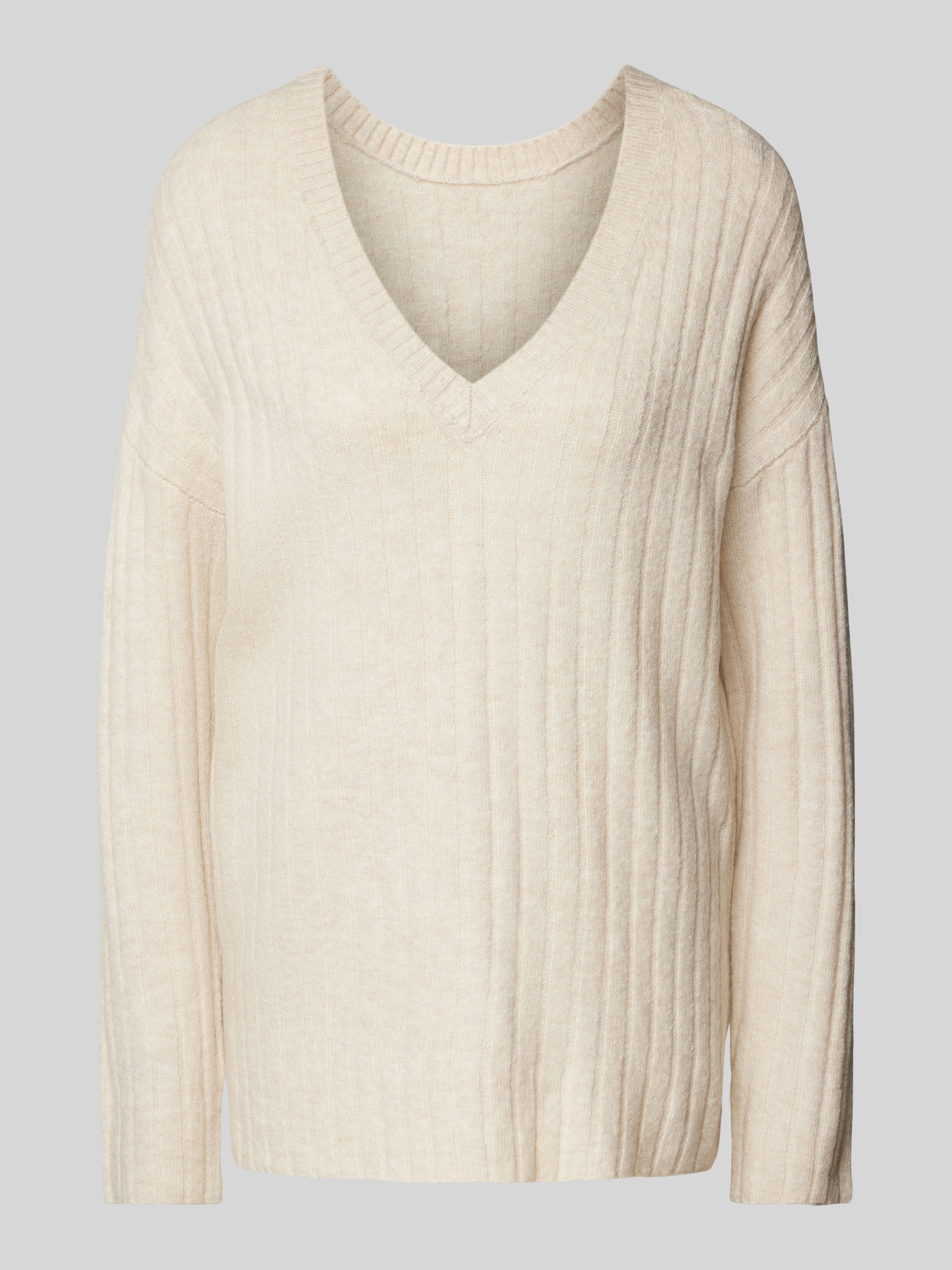 Sweter z dzianiny z dekoltem w serek model ‘MIRAZ’ - beżowy